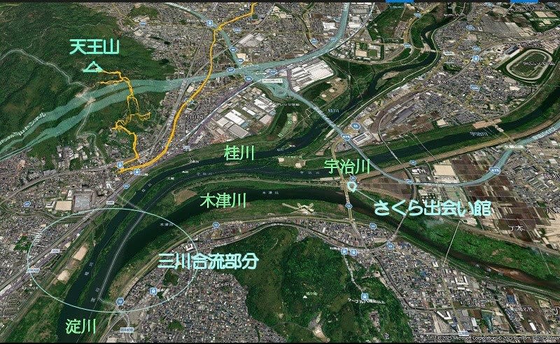 その間の谷間が「水越峠」でそこを抜けて 金剛山の向こう側を 右方向に走り 再び県境の山の