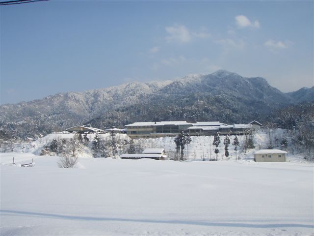 国道432号からみた玉峰山荘。背後の山が去年末に登った玉峰山のはず。