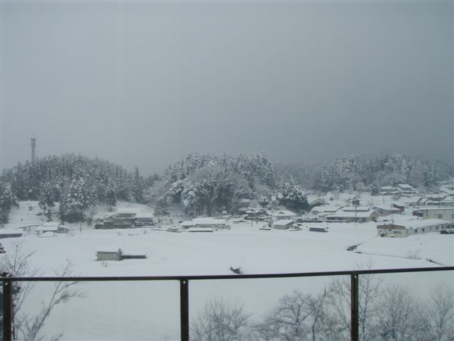 暖房の効いたロビーから亀嵩の町を見下ろす。雪はまだ降り続いている。