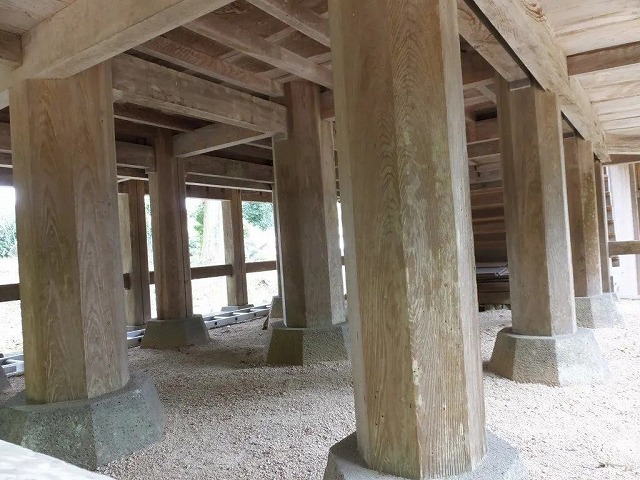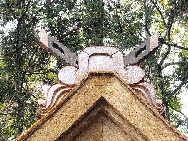 唯一残った千木は横削ぎで出雲様式ではありません。直線的、かつ平入り、2間3間の神明造り