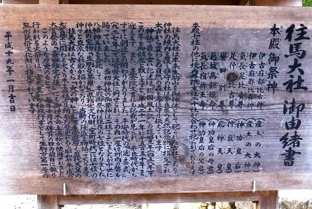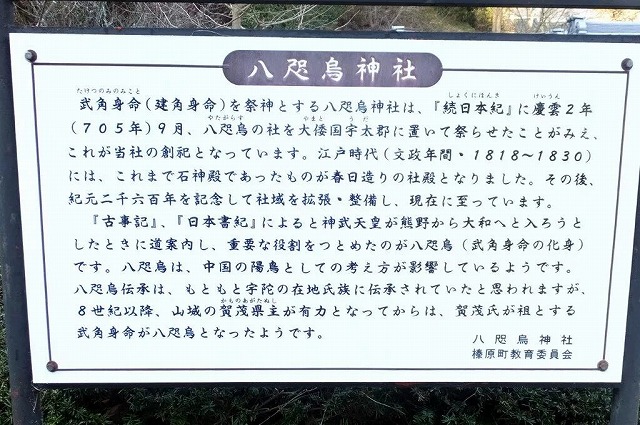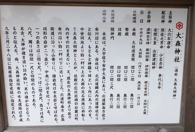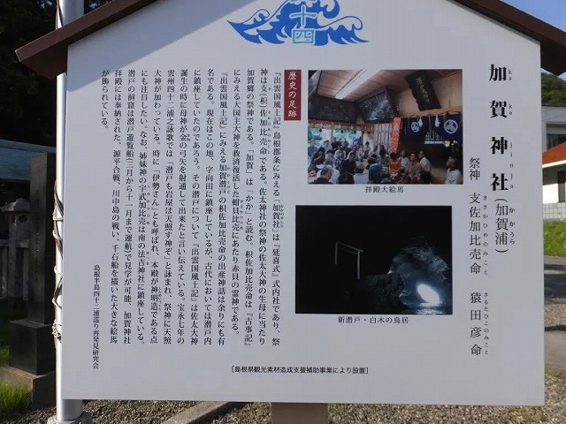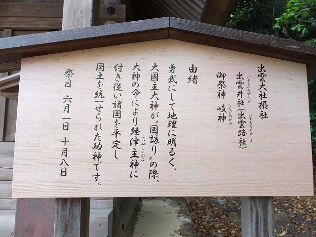 韓竈神社の説明看板だ。素戔嗚が(秦国から)朝鮮半島へ渡り、(出雲に)やって来たと書いてある。