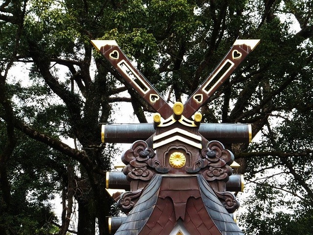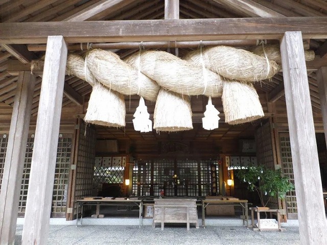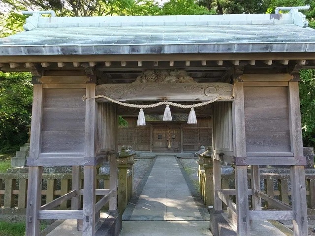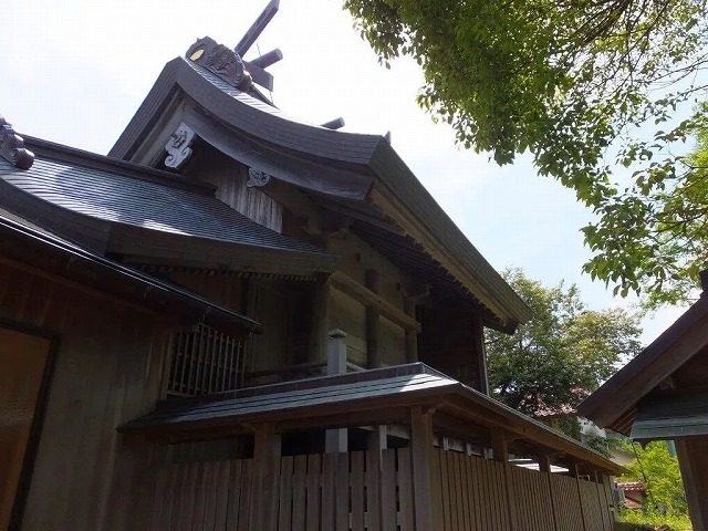 鳥居を潜ると拝殿の奥に出雲式の立て削ぎの千木が見えてきます。