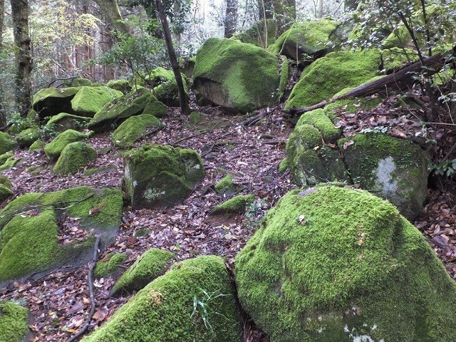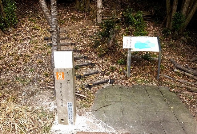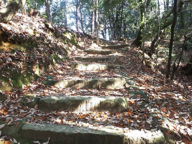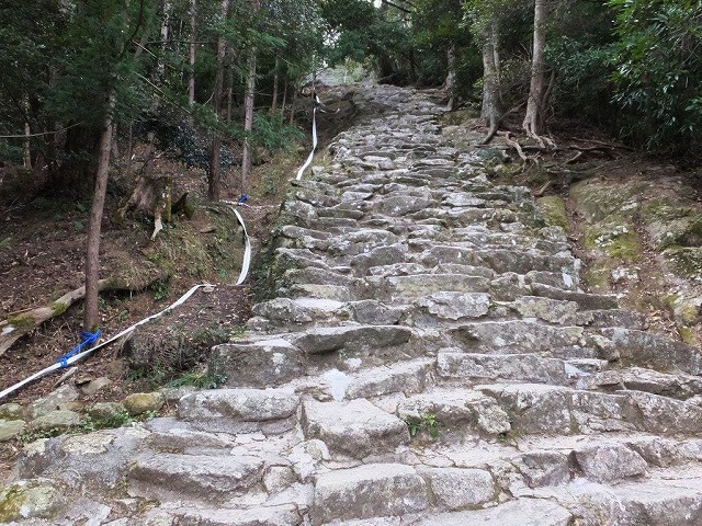 巨岩を削った階段が現れて、その先に木の根階段が続く。