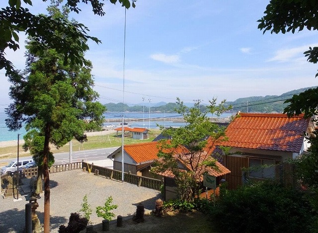 神社の石段から見下ろした千酌海岸と集落です。赤い「石州瓦」の家並みが美しいですねえ。