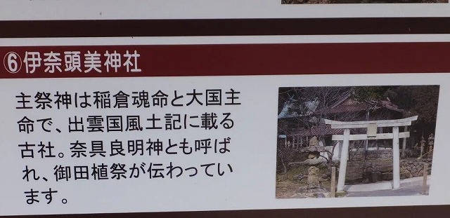 一方松江市教育委員会の立てた説明看板では 「主祭神 は稲倉魂命」(うかのみたま)で字の