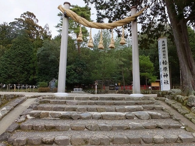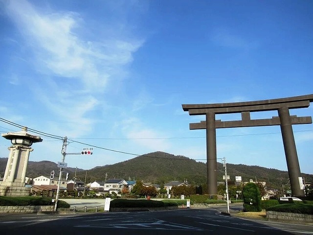三輪山です。隣の大鳥居は大神神社の大鳥居です。