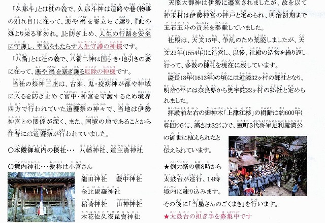この神社の主祭神は 久那斗(くなと)神 と八街比古(やちまたひこ)神、八街比賣(やちまたひめ)神