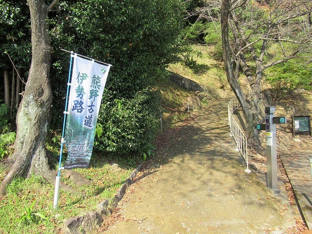 公園に出ました。説明看板があり 国道建設で破壊した伊勢路の代わりに公園周りの道を