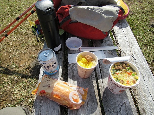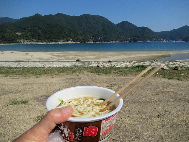 新鹿(あたしか)集落の雑貨屋さんで買ったお弁当とカップ麺 それにデザートでビーチの景色を満喫しました。
