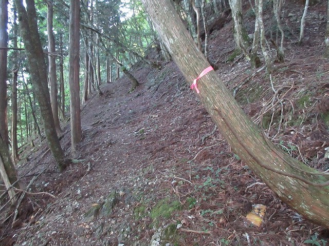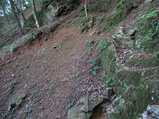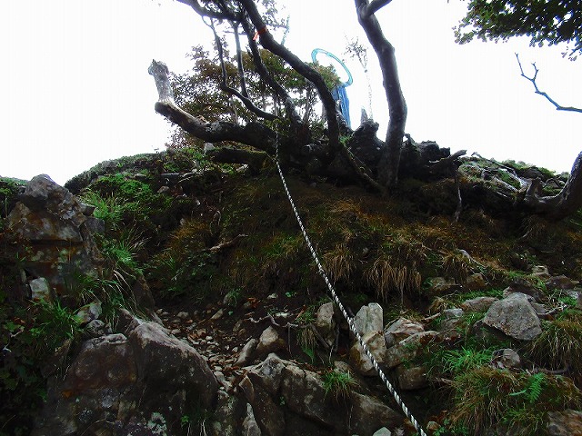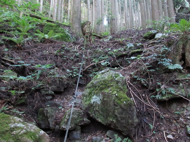 台風で崩れたのか、人に歩かれるのが嫌な 山主がロープを張ったのか。