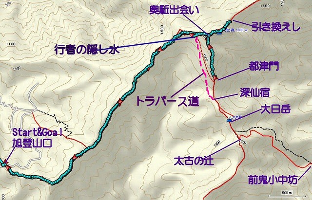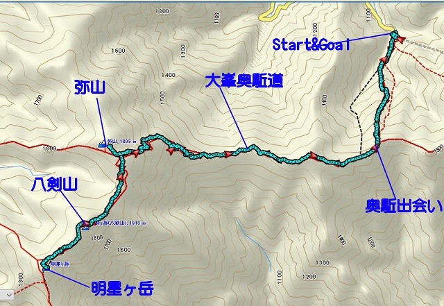 駐車場はありませんが 林道に路駐します。ブルーラインは奥駈まで登る道で、赤いラインが今回歩く