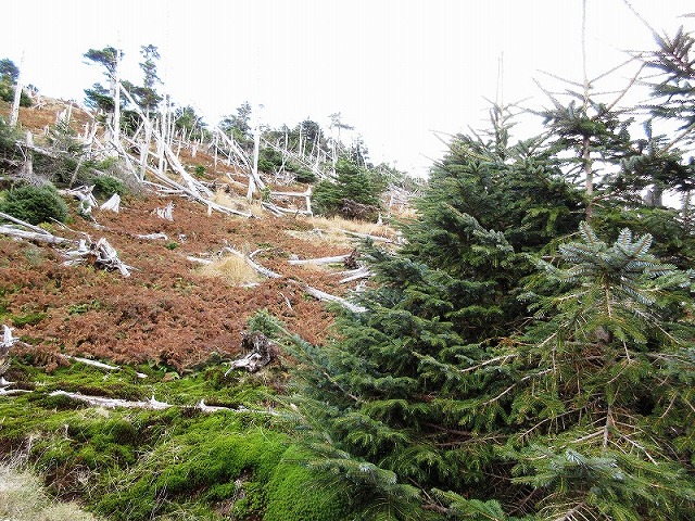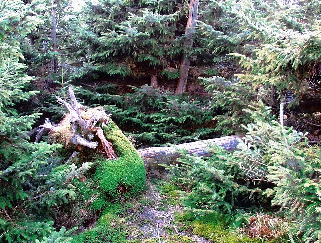 来る時に結んだテープを目印に帰りますが、それでもすぐに 方向とテープを見失い、何回も後戻りしながら、七面山東峰を目指して歩きます。