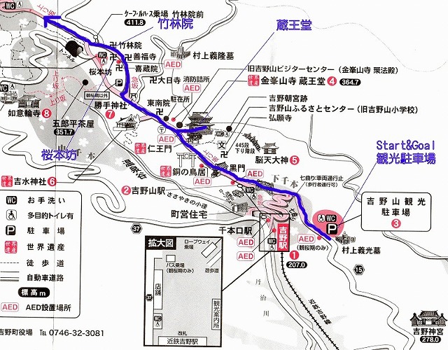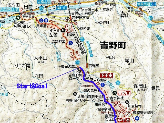 午前7時15分でした。下の図は、自転車を押して歩いたコース、そして歩いたコースを色分けしています。