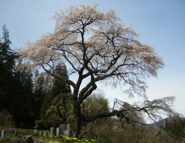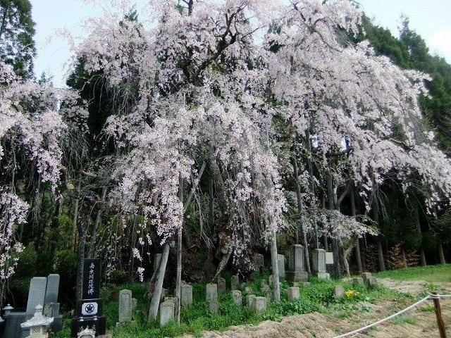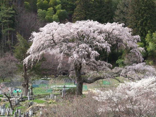 村の共同墓地で 巨大なかさを広げたような形の枝垂れ桜だ。