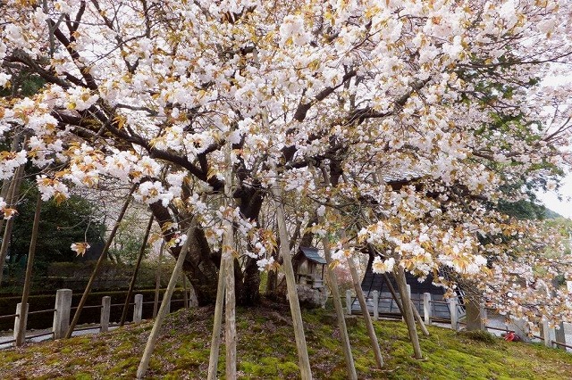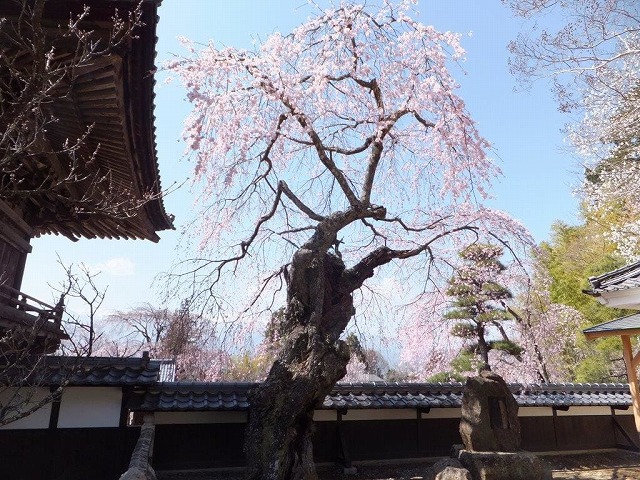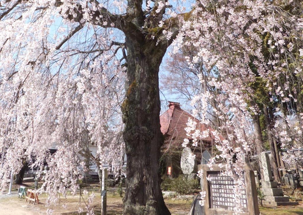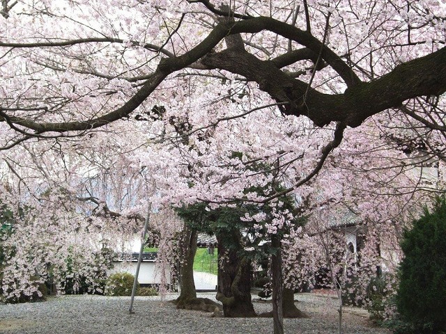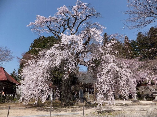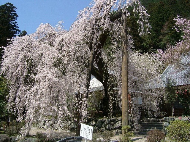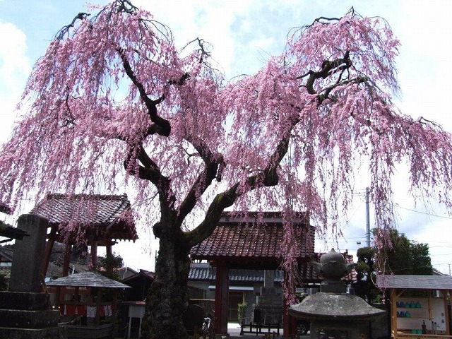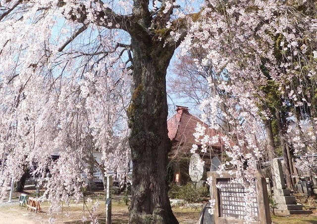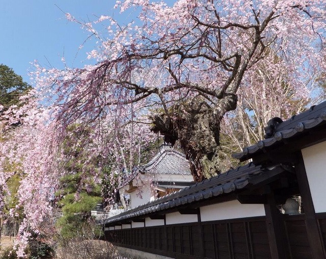 境内には4本の枝垂桜と2本の大山桜の古木があり春の境内は桜一色に染まる桜の名所だ。