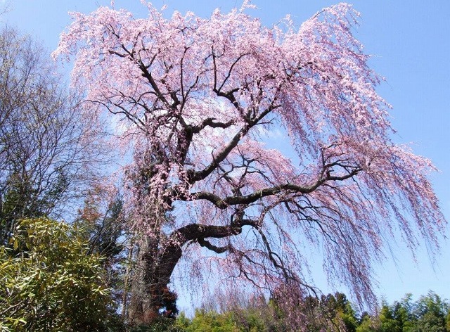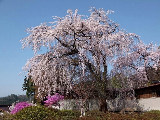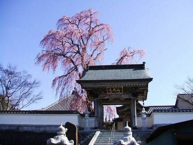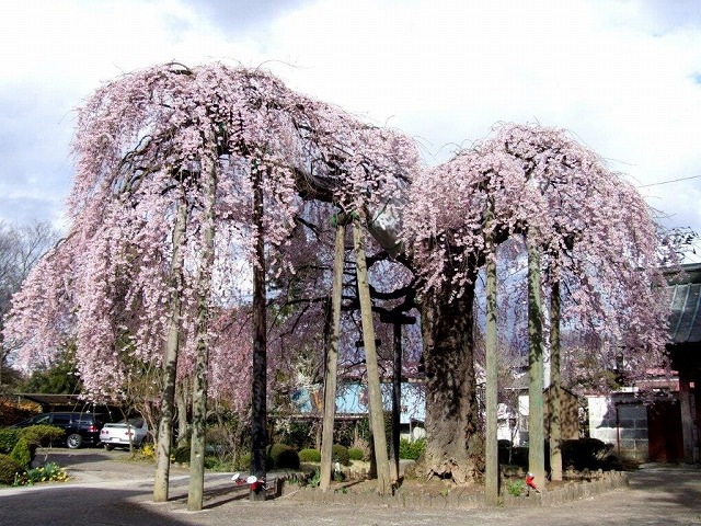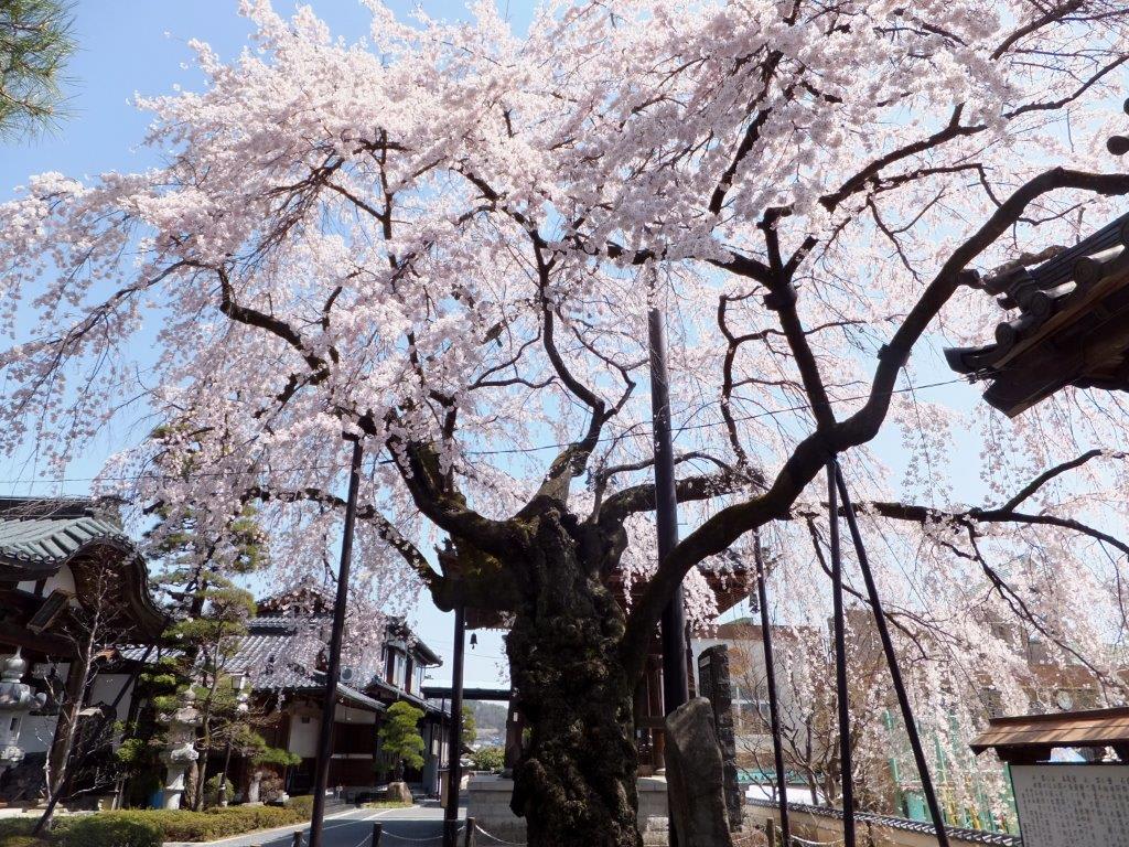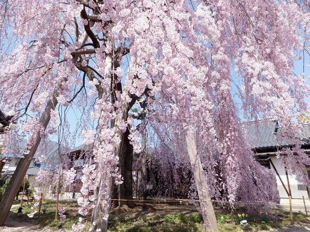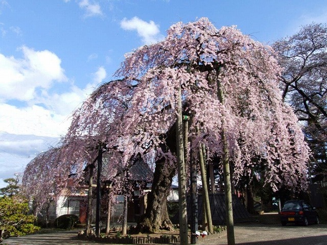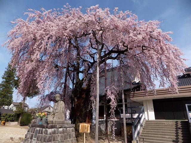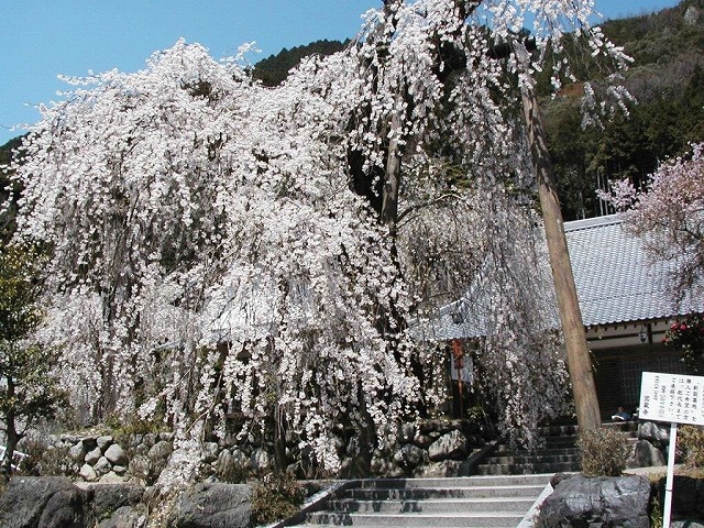 境内には4本の枝垂桜と2本の大山桜の古木があり春の境内は桜一色に染まる桜の名所だ。