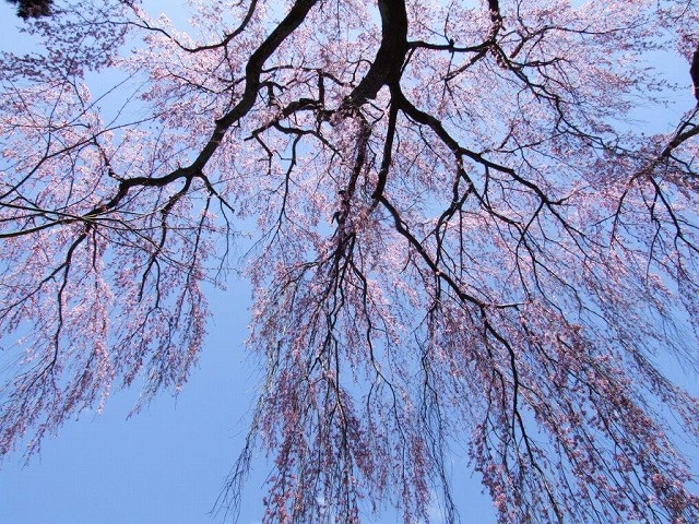 この樹齢300年といわれる枝垂桜は 添え木が一本あるものの 空に向って大きく立ち上がる印象の桜だ。