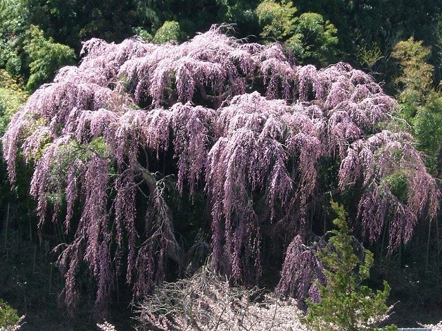 三郷地区の墓地に生えているきれいな枝垂桜で樹齢600年とか。ピンクのカーテンのようだ。