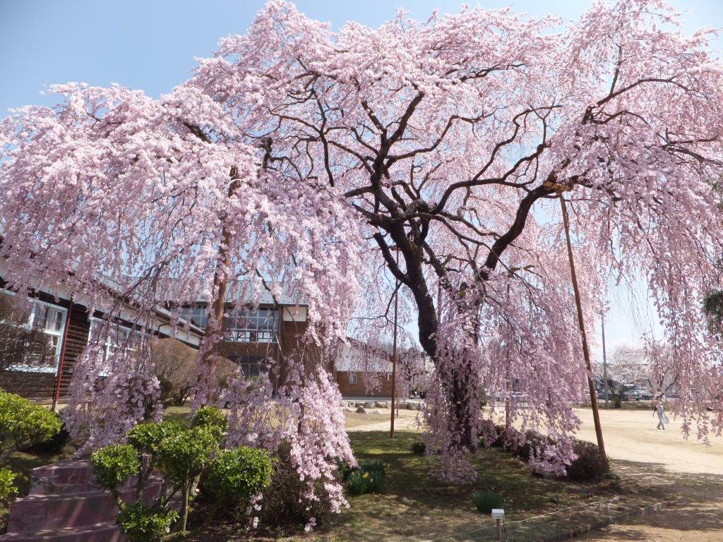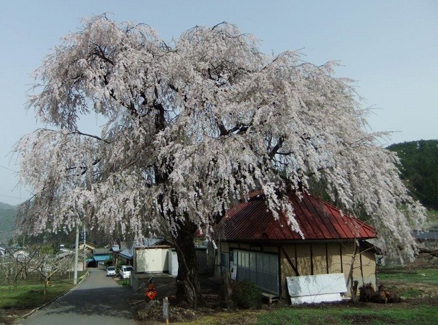 集落のはずれの公民館の屋根を覆うごとくに 大きく枝を広げて咲き誇っていた。