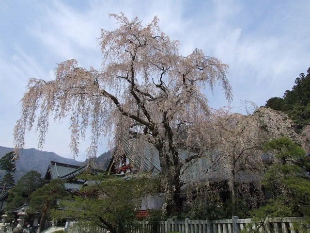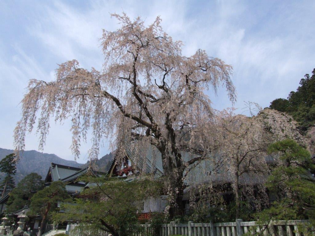 歌聖西行の終焉の地で知られるこの寺の境内には 巨大な山桜が本堂を覆う。