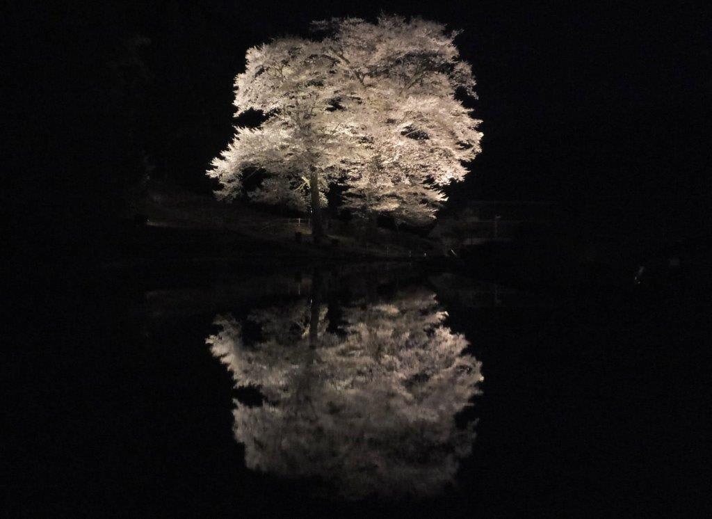 夜間のライトアップに人気があり、昼間の数倍のカメラマンが集まる人気桜だ。