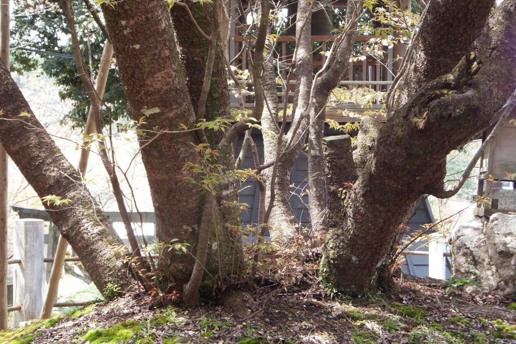樹齢1000年のアズマヒガン桜の胴体も凄い迫力だ。足元には小さな祠があった。