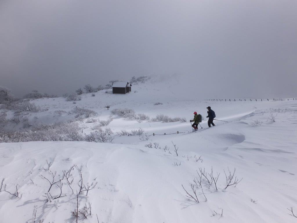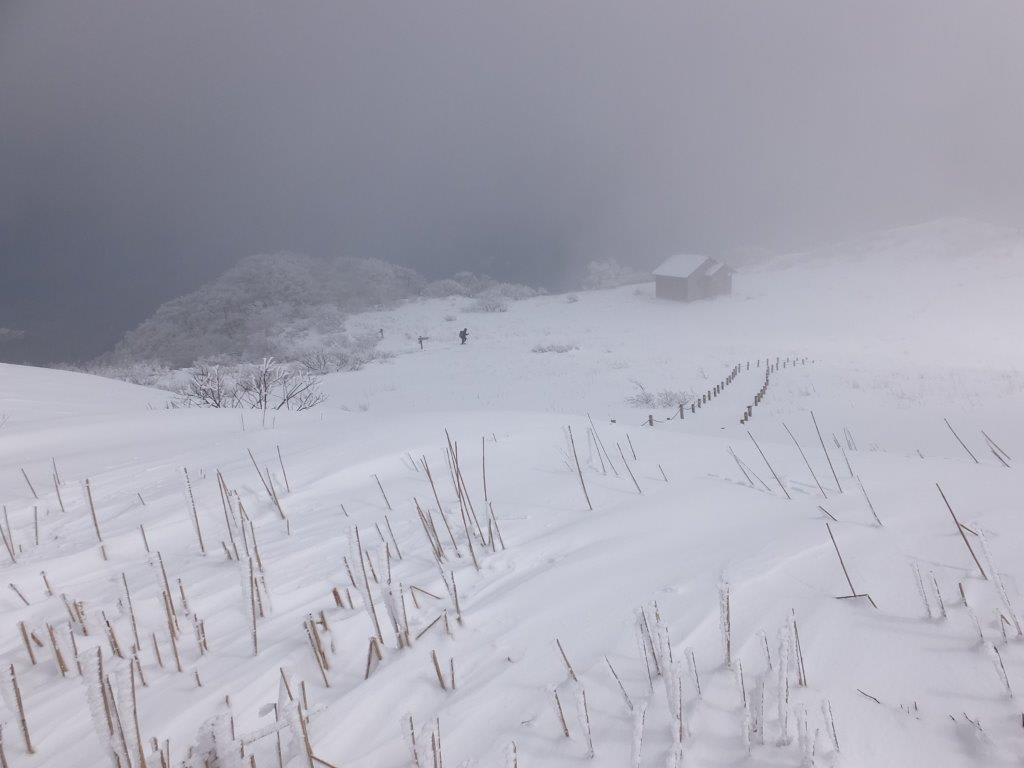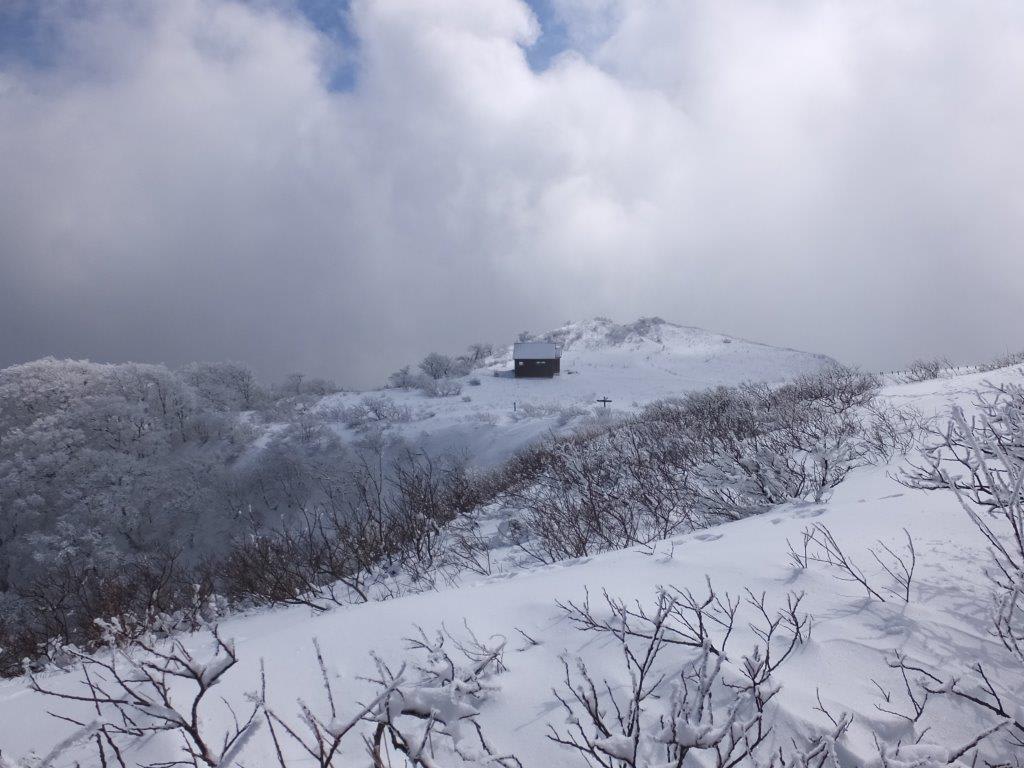 ジグザグの登り道を進むと やがて山頂避難小屋に着いた。