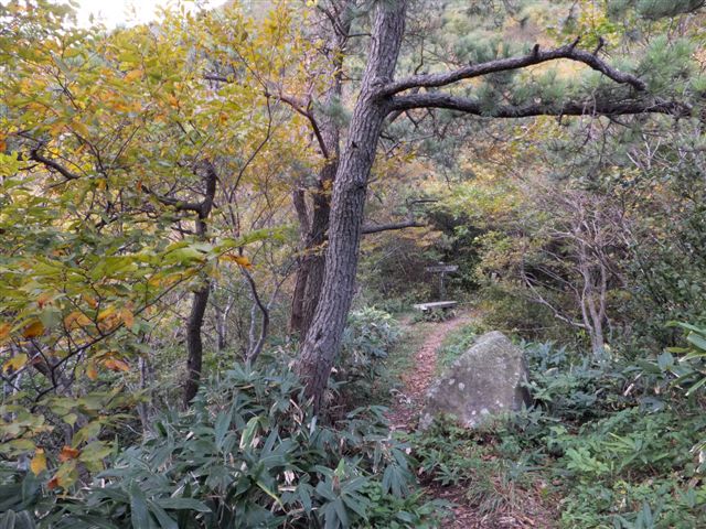 琴の岩屋分岐の標識があるが、笹薮に覆われて道が不明であり、300
