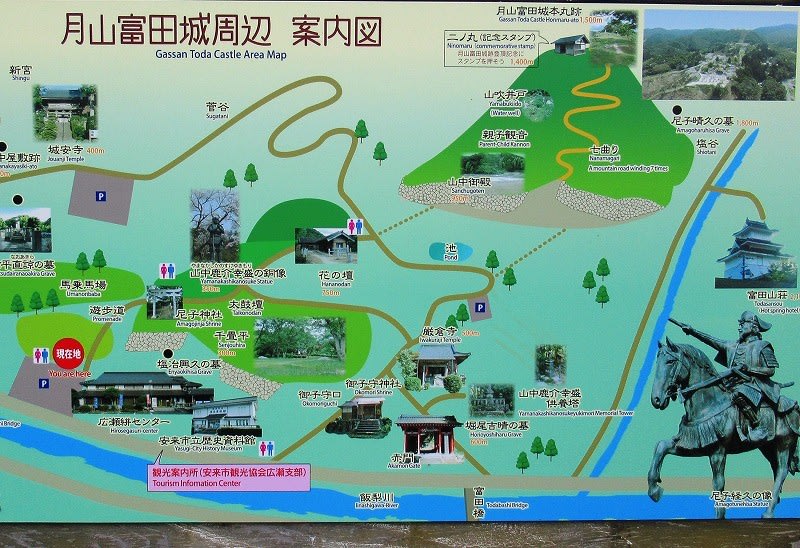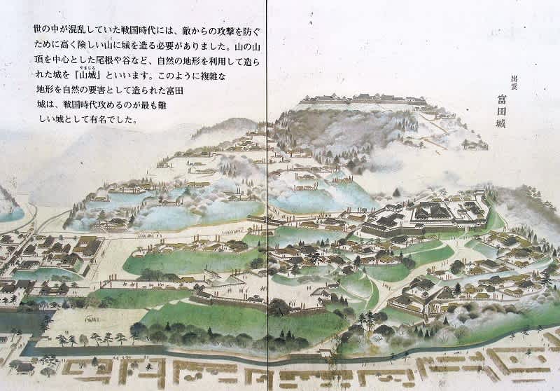 広場に立っている富田城の復元図です。右中央にたくさんの屋敷跡が書かれているのが 山中御殿です。