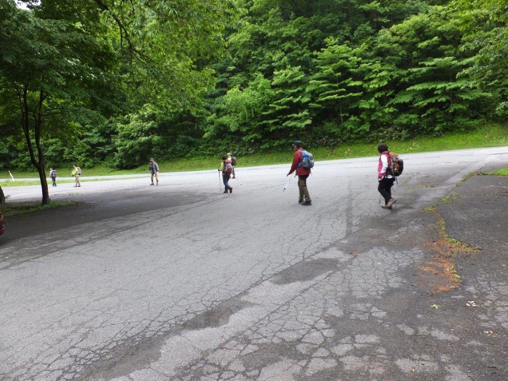 車を置いてしばらく林道を歩くと広い場所が。どうやらここが駐車場で