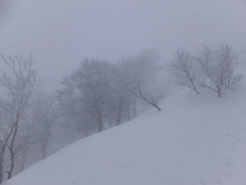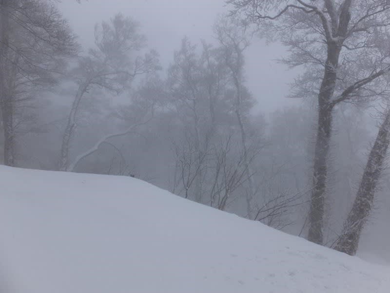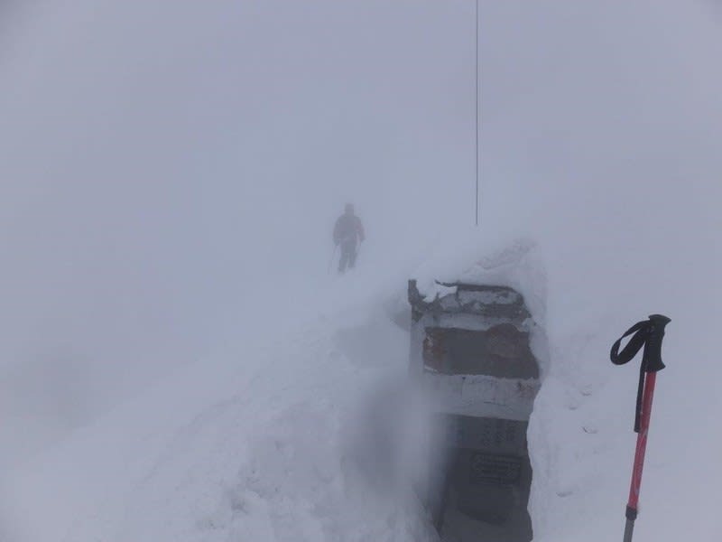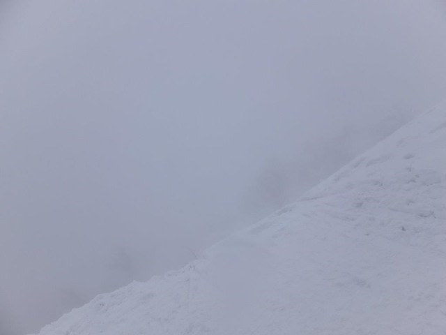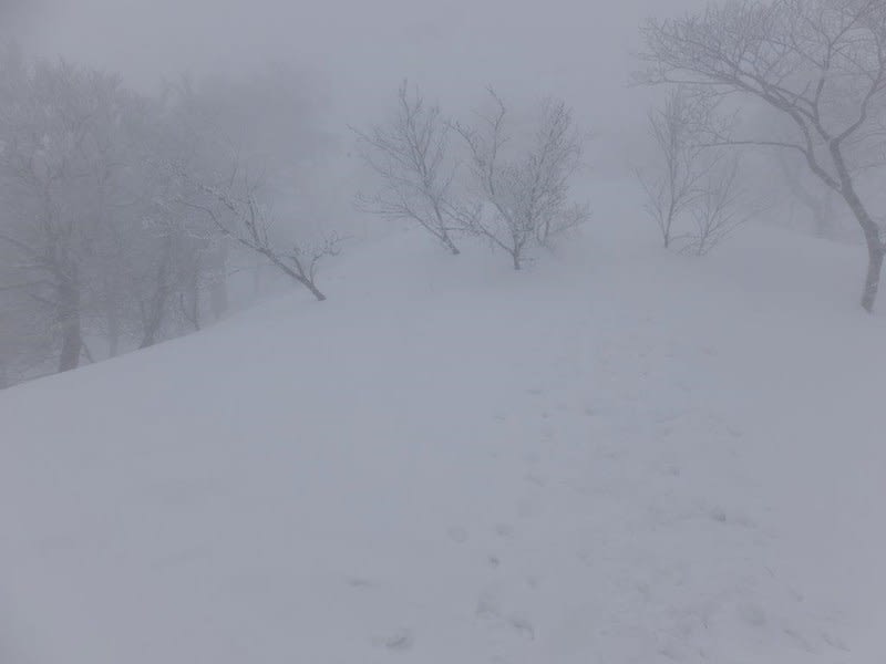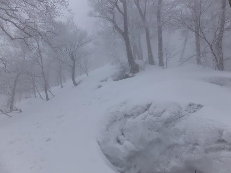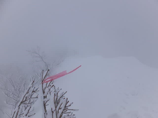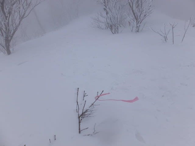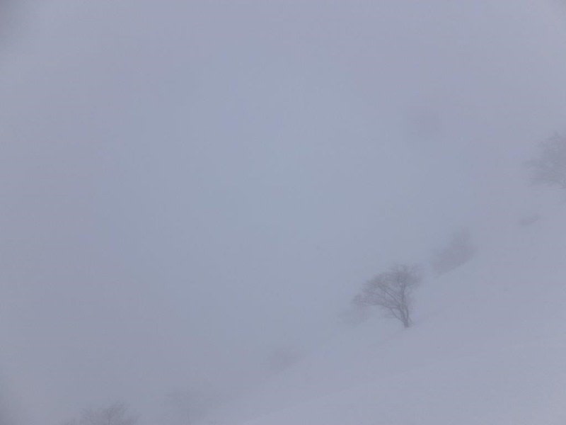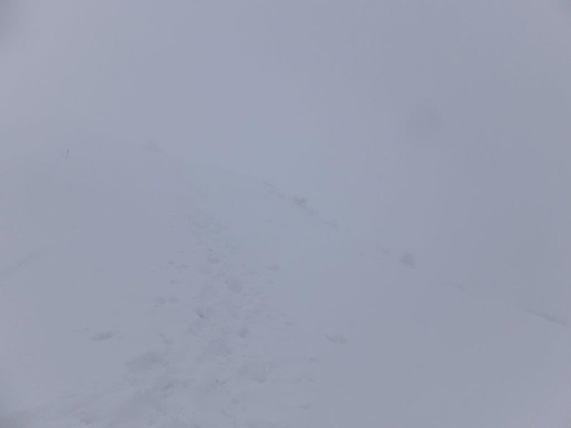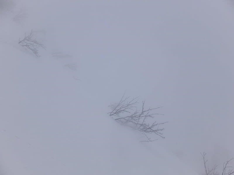 ホワイトアウト寸前です。元谷方面の斜面のエッジが微かに見えるので 落ちないように一歩ずつ
