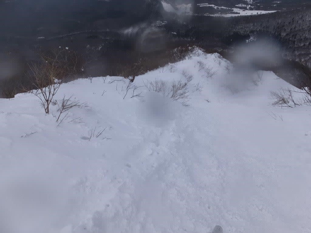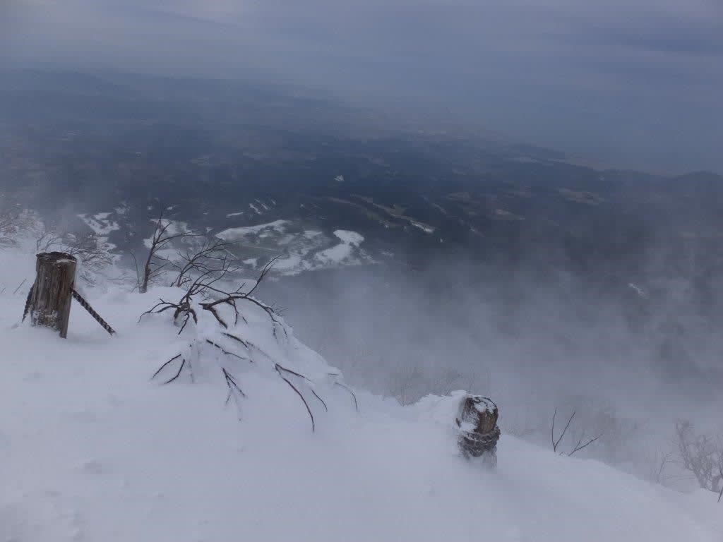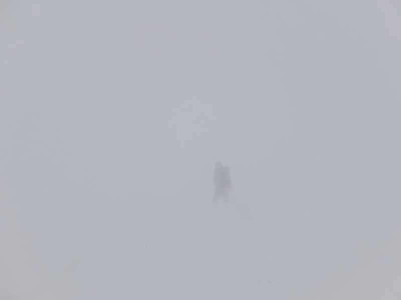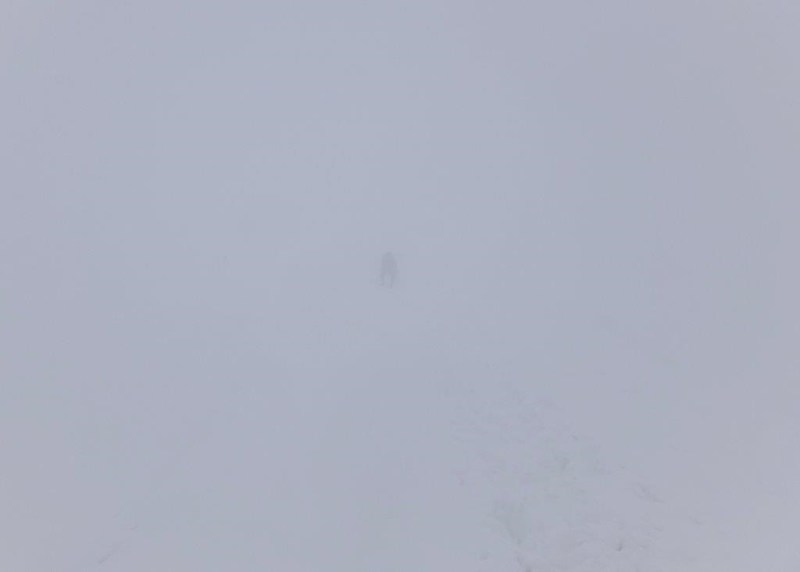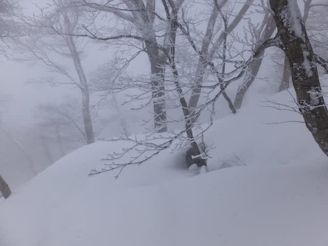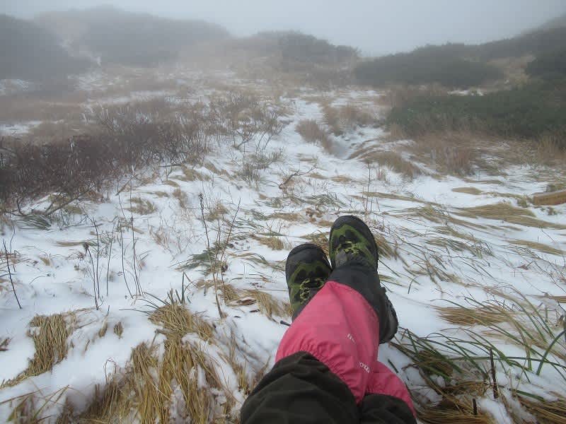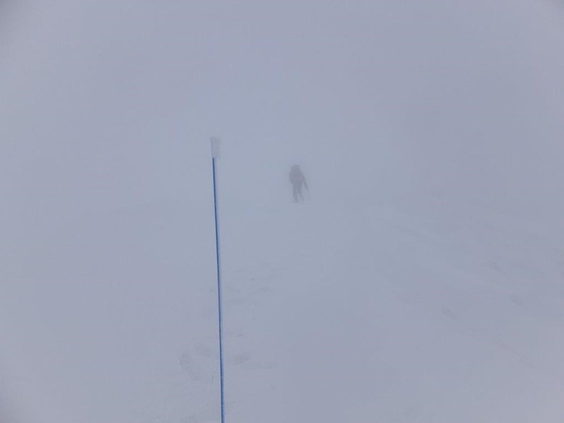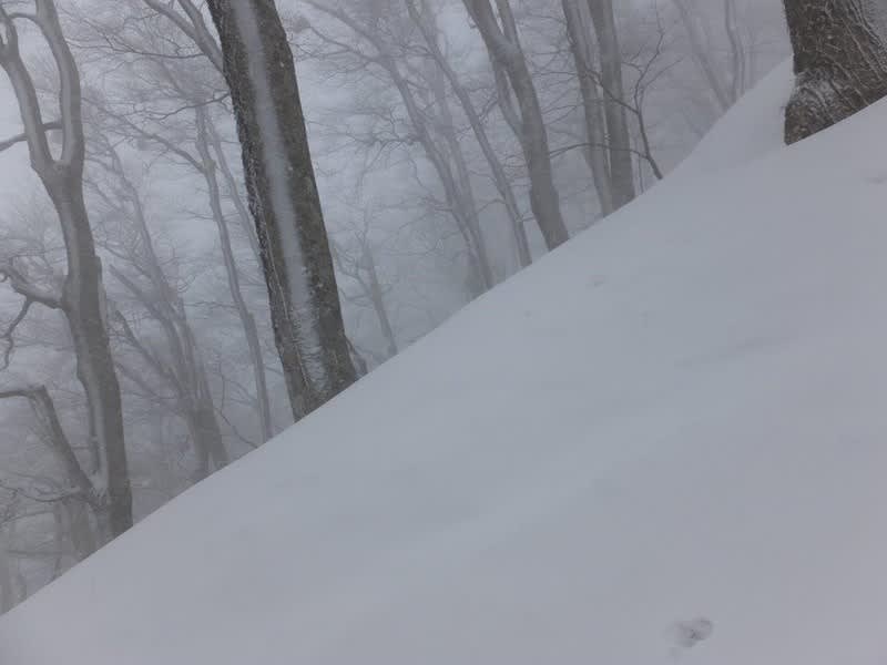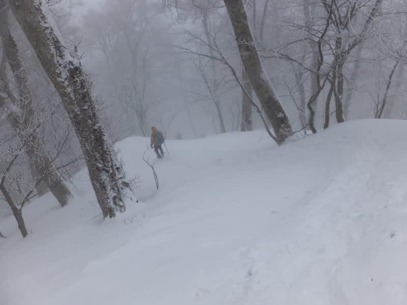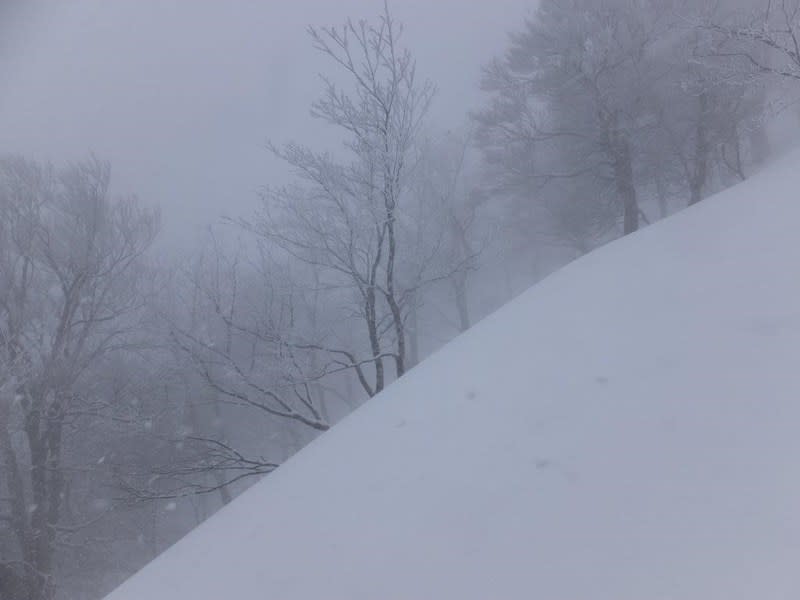 ホワイトアウト寸前です。元谷方面の斜面のエッジが微かに見えるので 落ちないように一歩ずつ