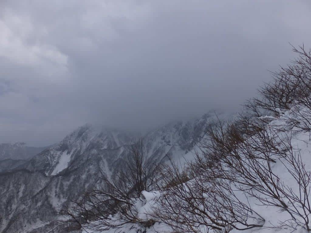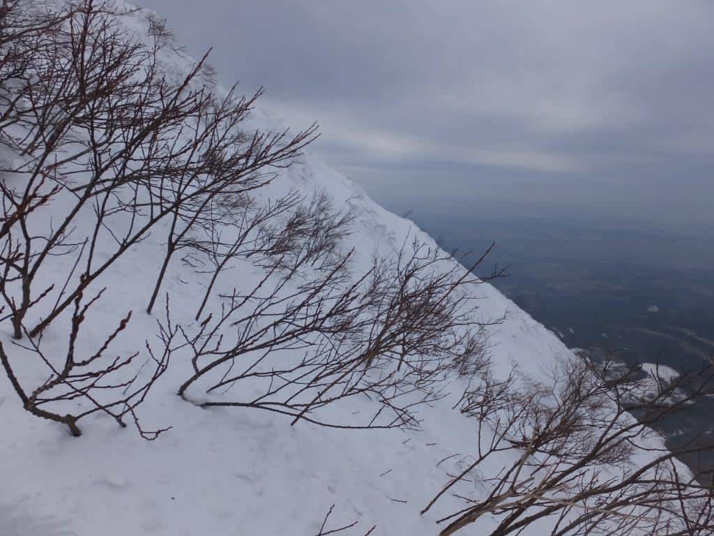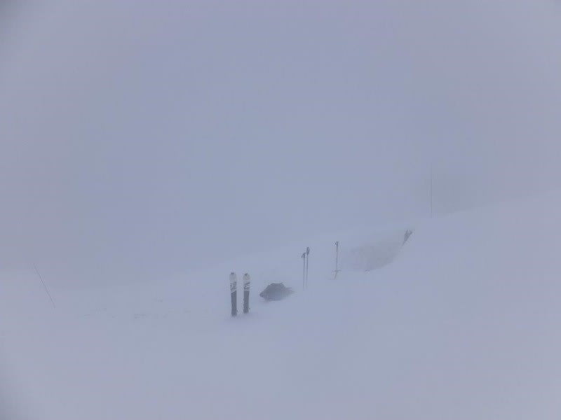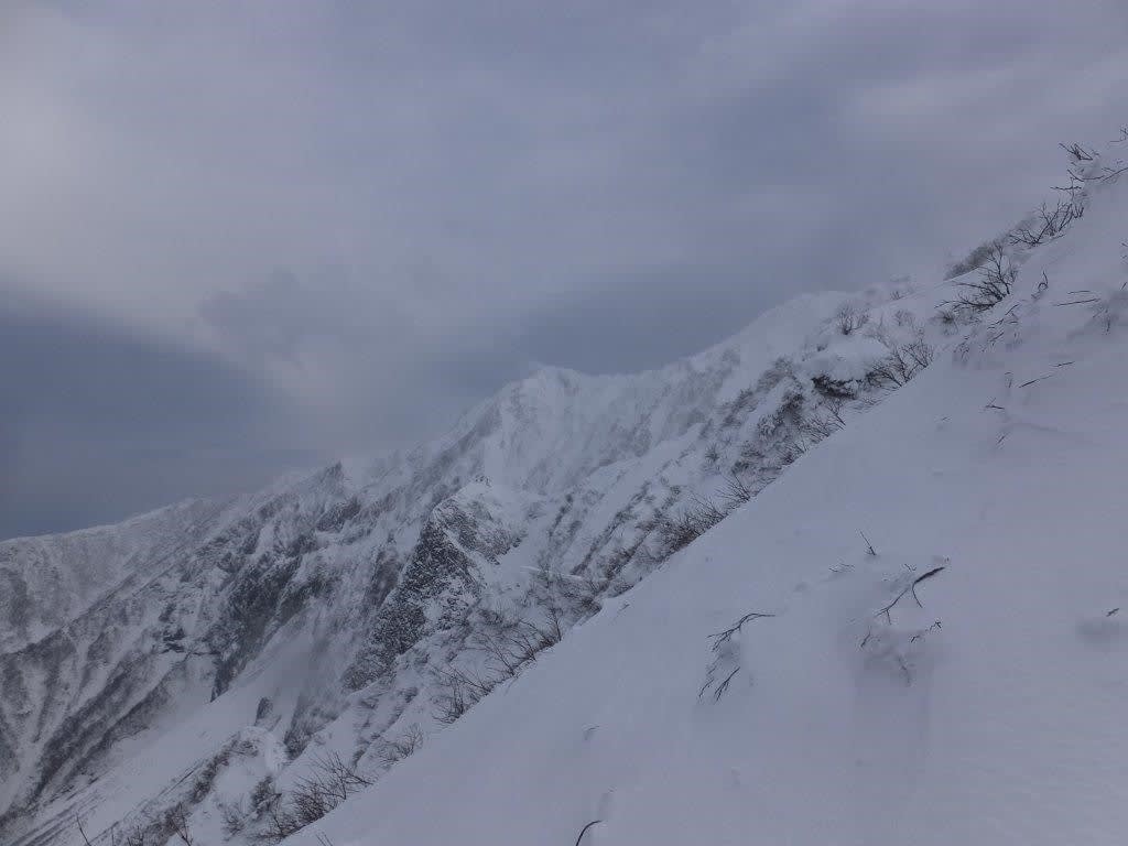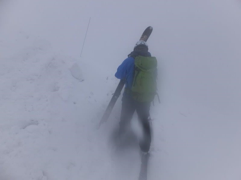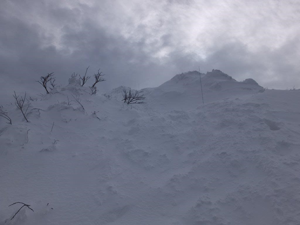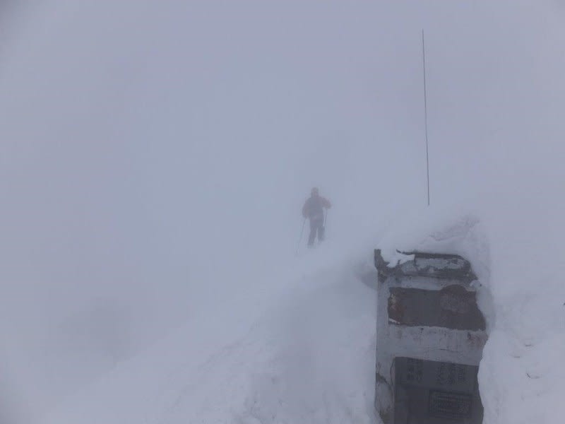 ホワイトアウト寸前です。元谷方面の斜面のエッジが微かに見えるので 落ちないように一歩ずつ