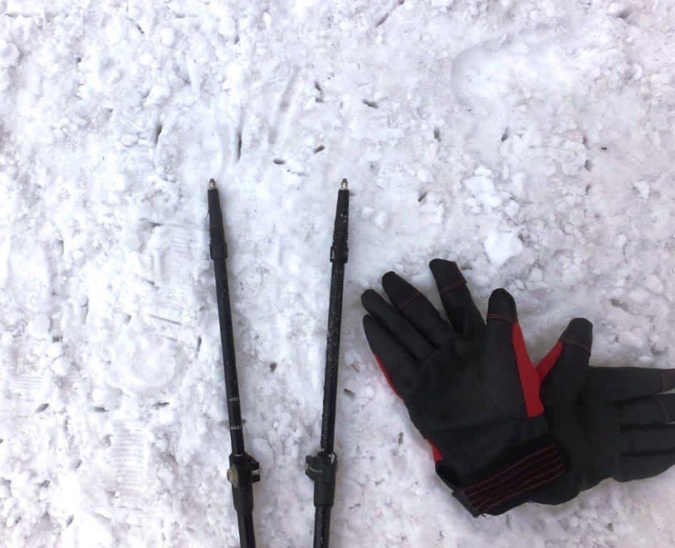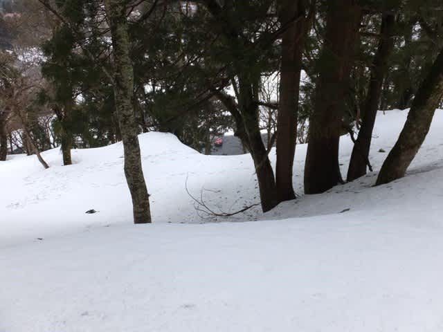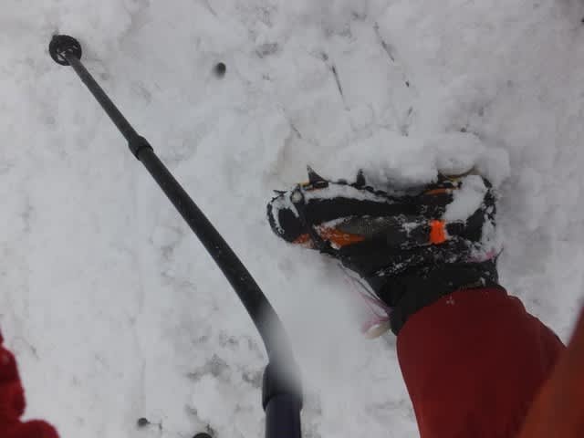 雪が少し緩んだようです。斜面に足を踏み出して踏ん張った途端 団子で滑りストックの上に
