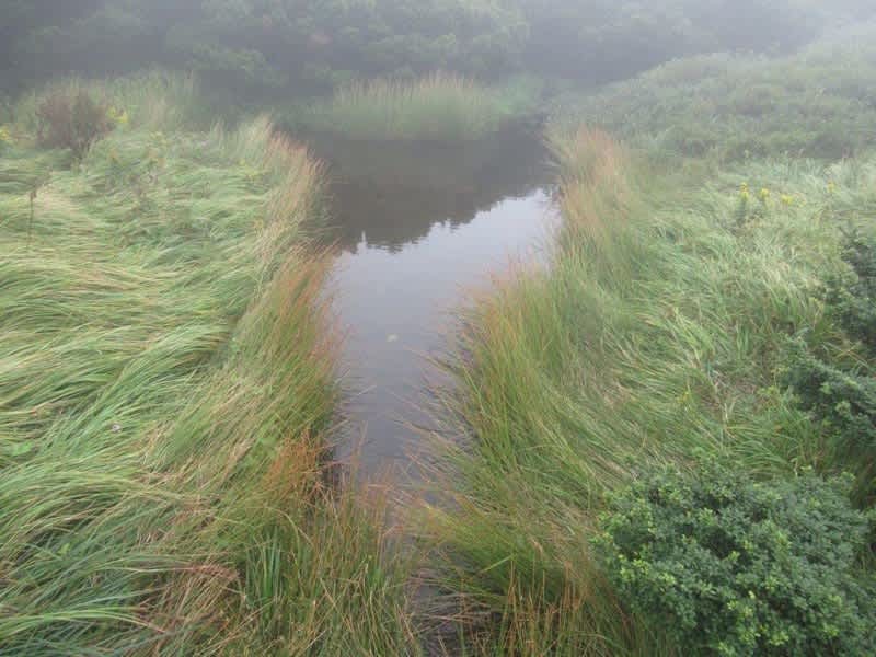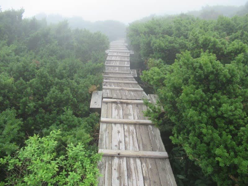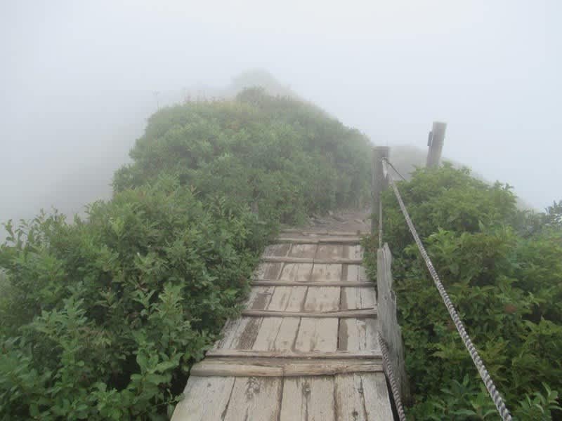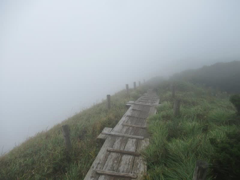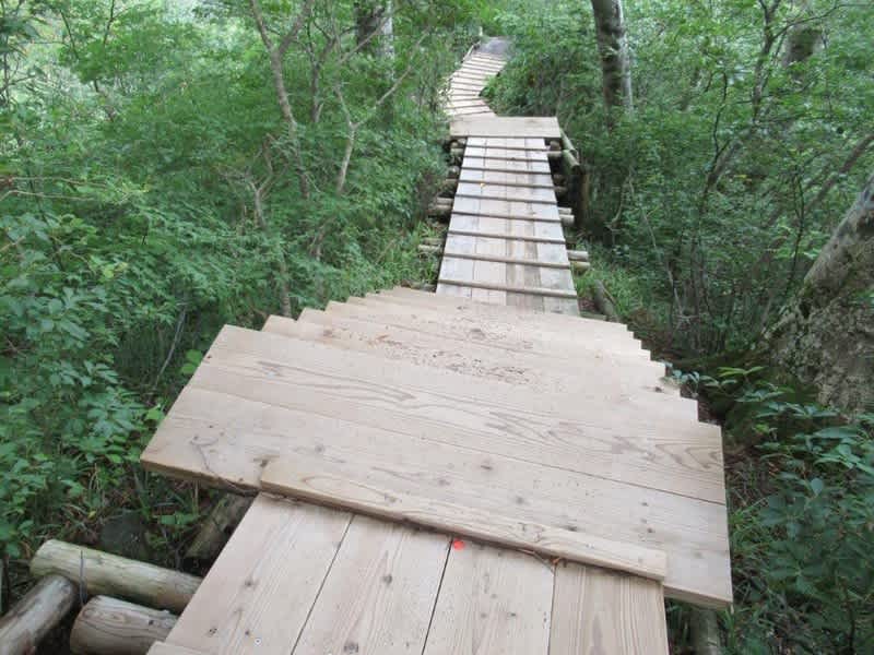 木道から滑り落ちたら大変だ。助からないだろうなあ。木道の横桟に慎重に足を置きゆっくりと進む。