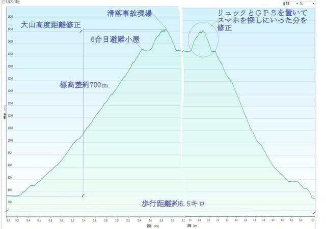 高度と距離の記録です。六合目まで降りてきて、私を助けた方のスマホを探しに再び登ったときは