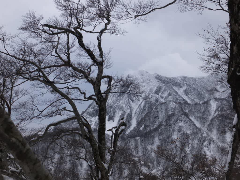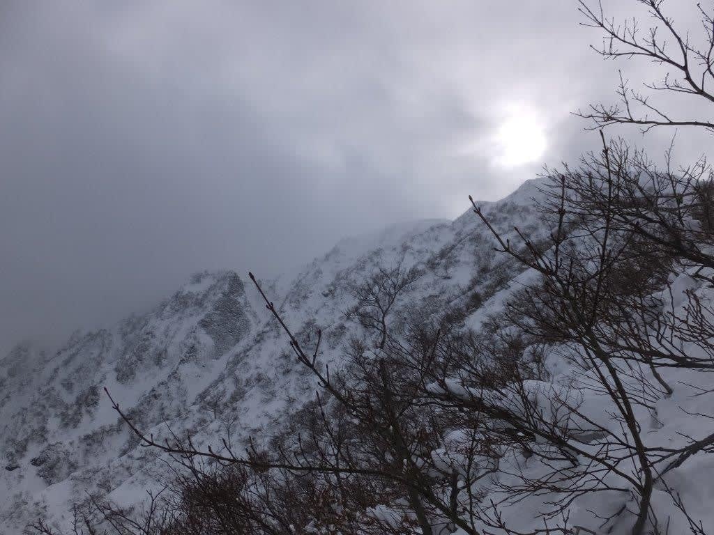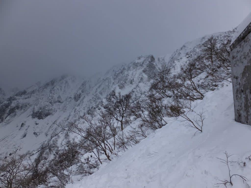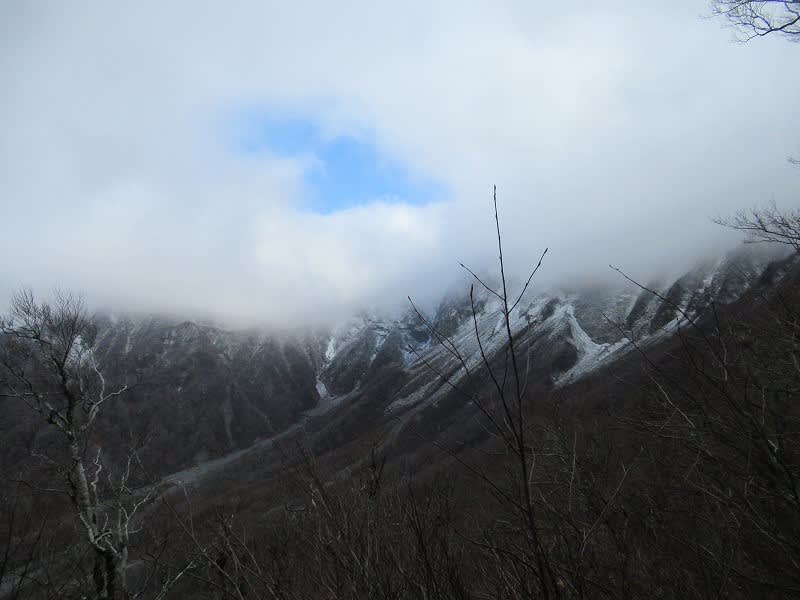 元谷から見上げると 山は分厚い雲に覆われていました。上は依然として吹雪いているのでしょうね。