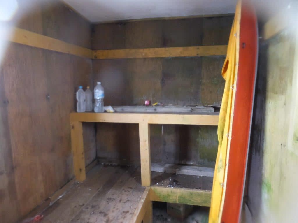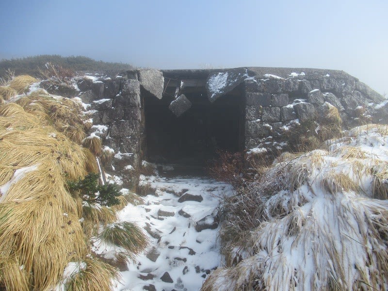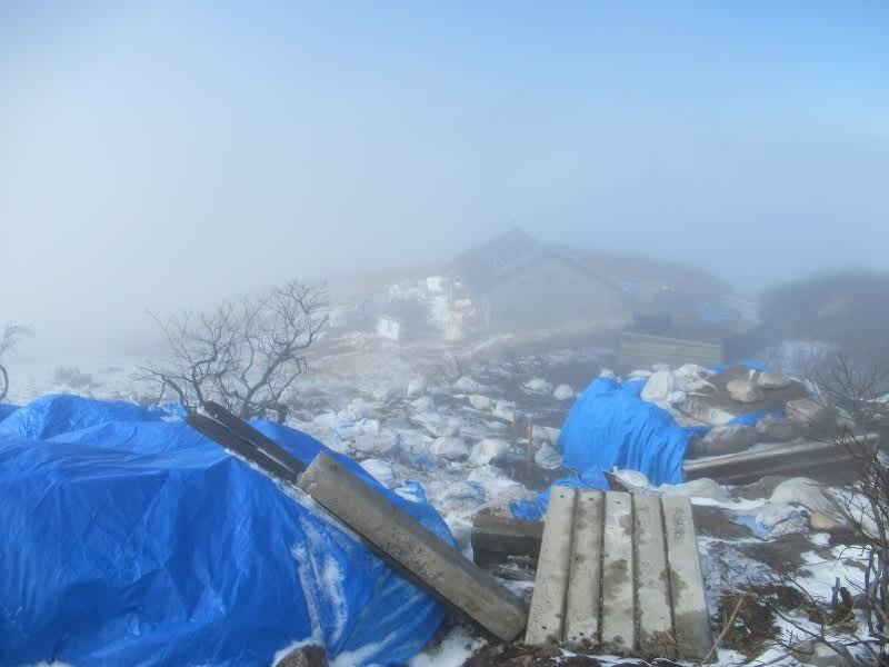 六合目避難小屋も工事中です。前は畳1枚分の床と狭い土間しかなくて しかも厳冬期には雪に埋まりどこにあるのかわからないほど小さな