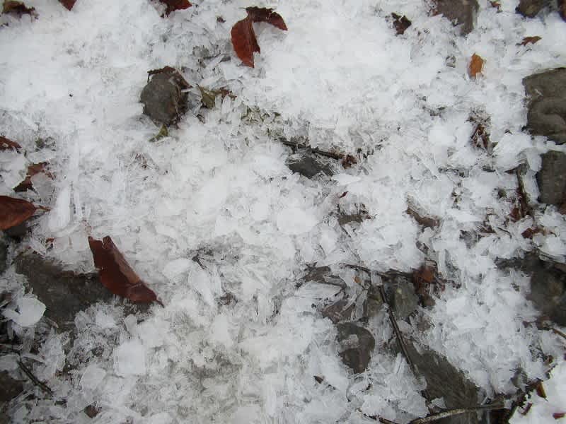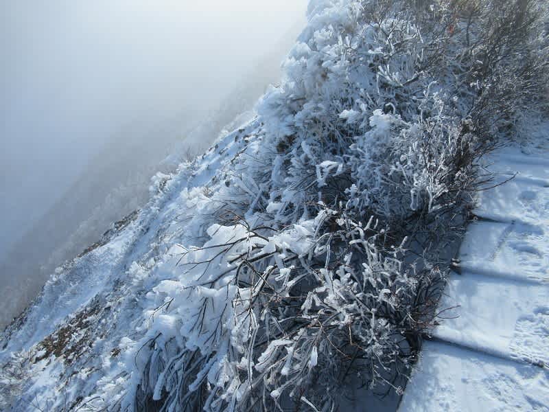 上から霧氷が落ちてくるのです。頭や全身に降り注ぐのでとても痛いのです。