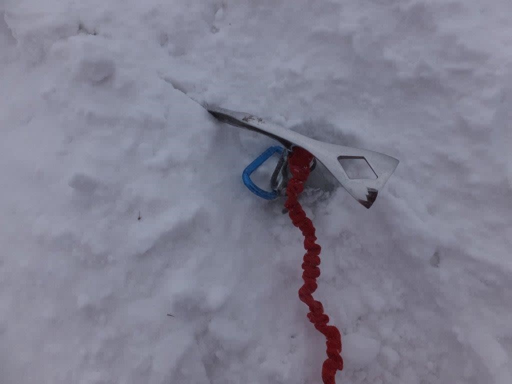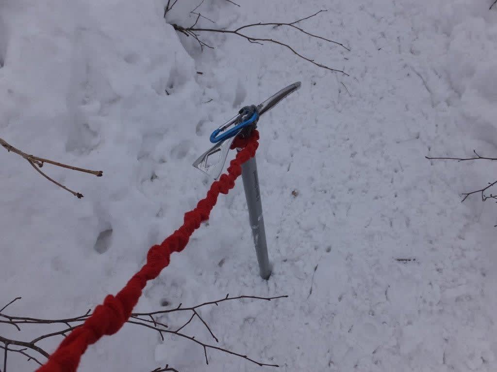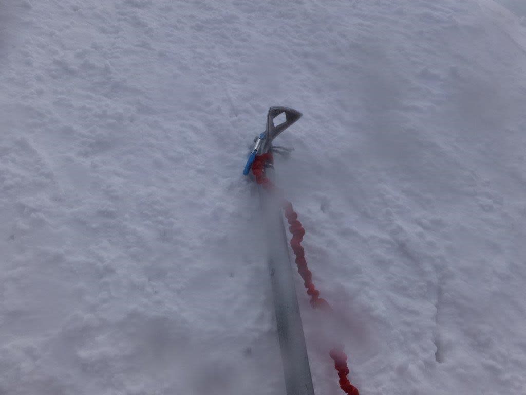 斜面に蹴りこんで 上の段に上がれました。不幸中の幸いで 雪質が硬く ピッケルや