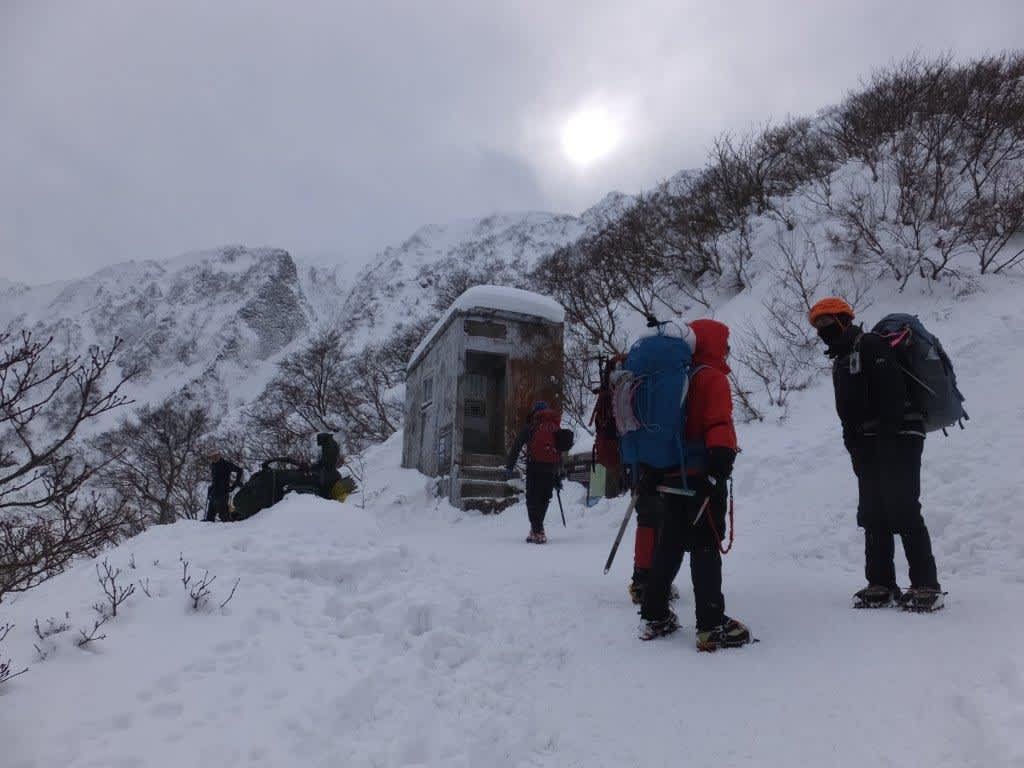 小屋の外で 吹雪が止むのを待っていたおじさんは 諦めて下山しました。