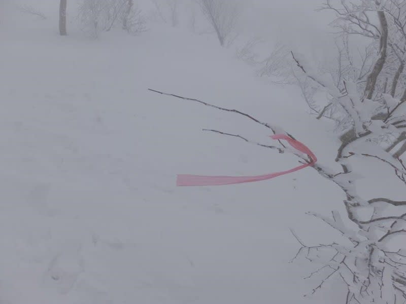 しばらく下ると ようやく枝が雪の上に現れて 私の付けたテープが見え始めました。