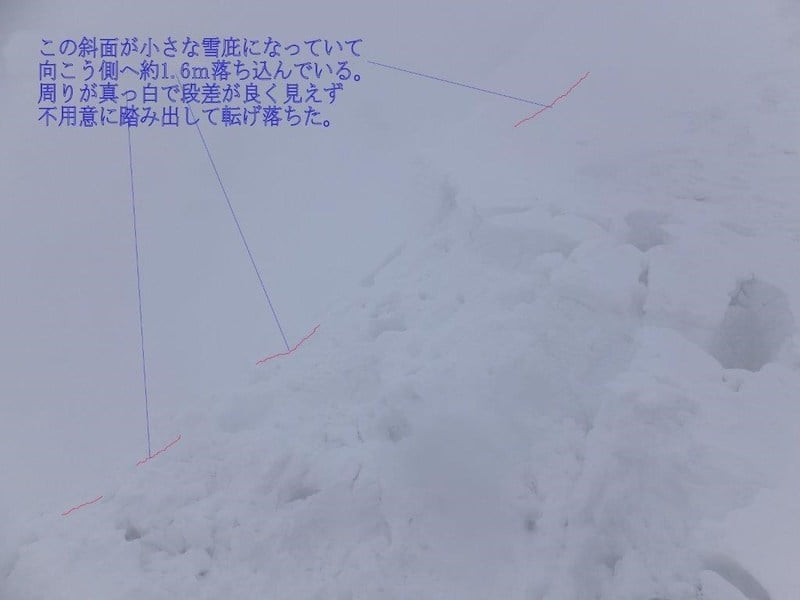 雪庇のエッジが見えてなくて 約1.5mの段差に前のめりに転落したのです。