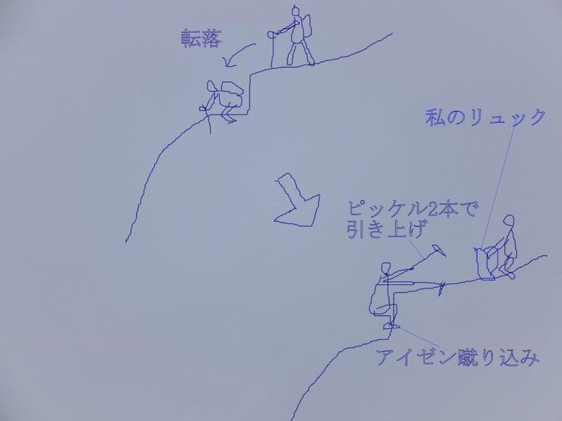 その方のピッケルを貸してもらい、私のピッケルと2本で体を引き上げて アイゼンの前歯を