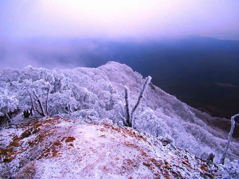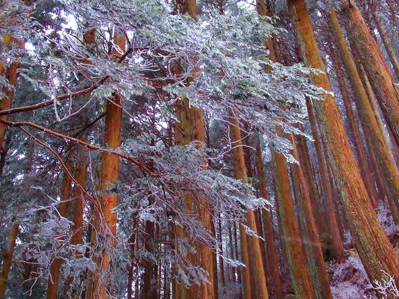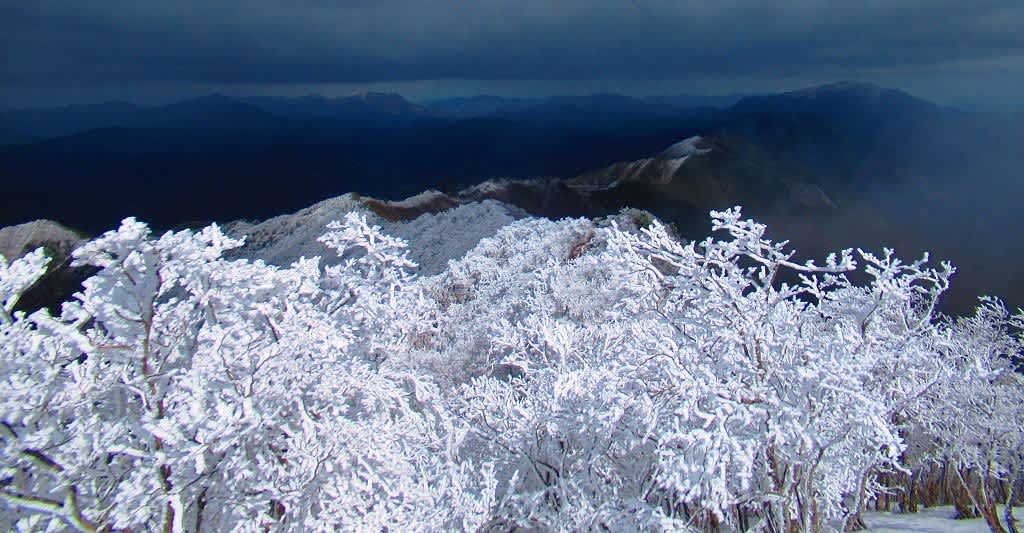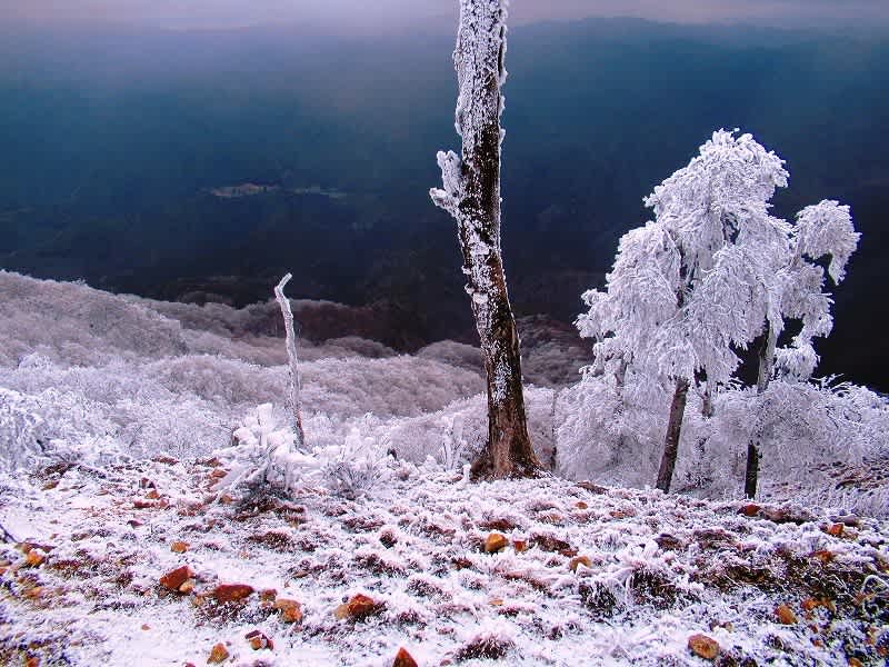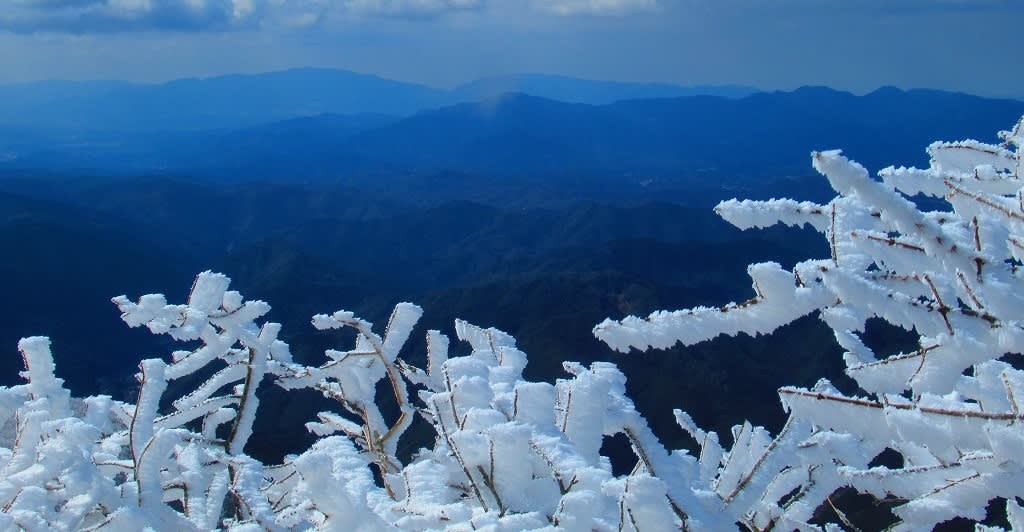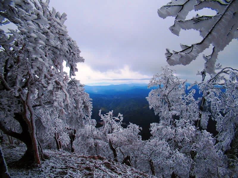 時々 木々の間から 遠くの山々が見えることはありますが ほとんどは霧氷の樹林帯を