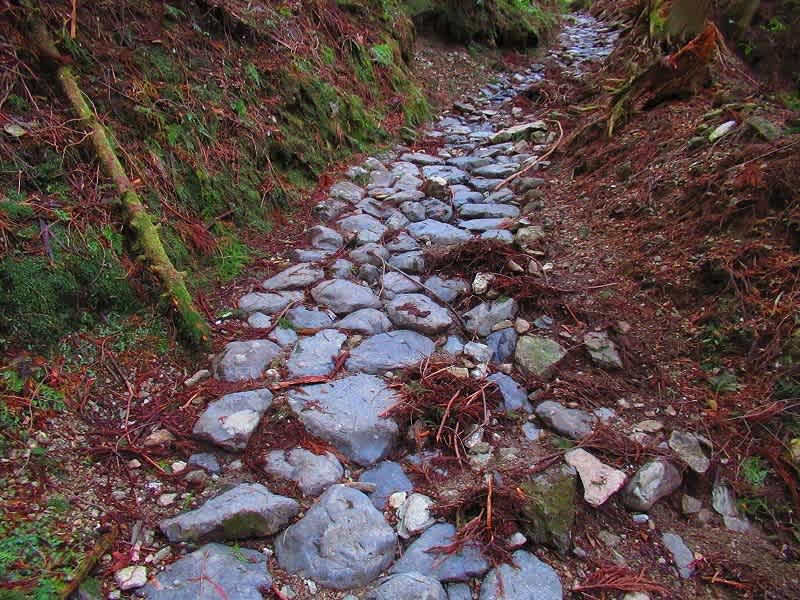 かなり下まで降りて よく探したらちゃんと指示の矢印がありました。やはりもう一つ右の谷へ