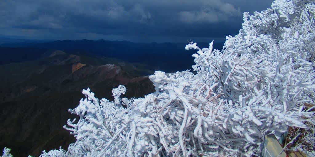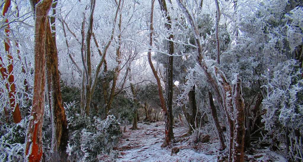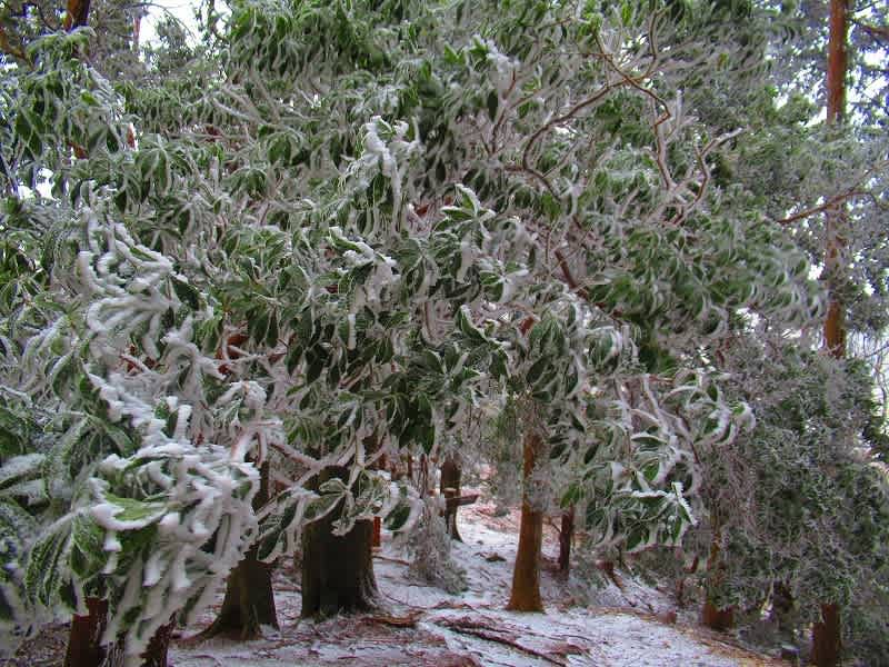 そこらじゅうの木に霧氷が大きくできて垂れ下がり とてもきれいです。