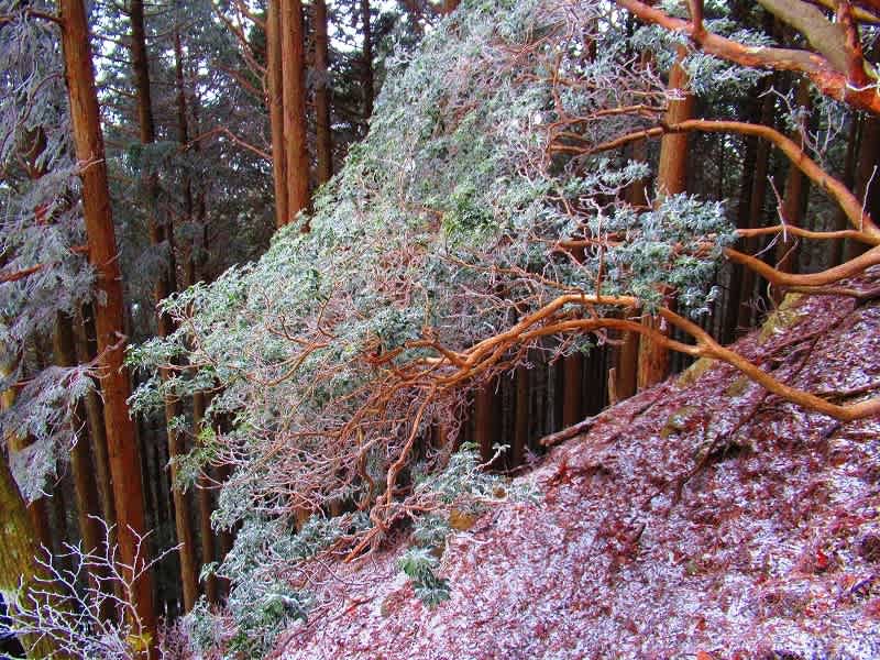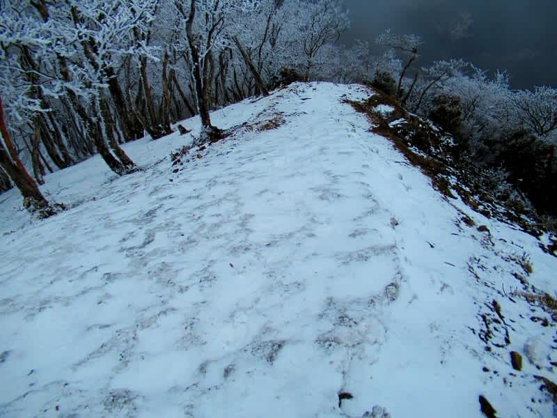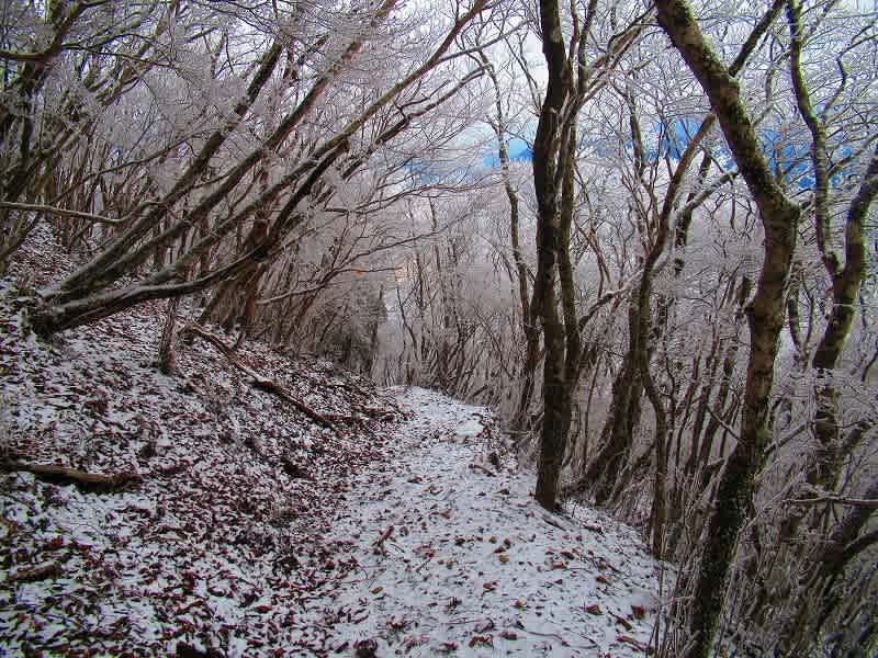 足元もちゃんと滑り止めが効いているので 垂れ下がり道をふさいだ霧氷の枝を安心して迂回しながら進みます。