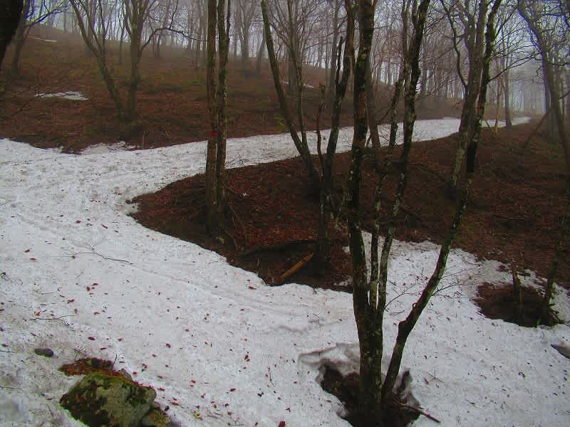 暫く登ると残雪が現れました。氷になっています。固くツルツルです。