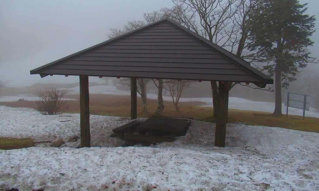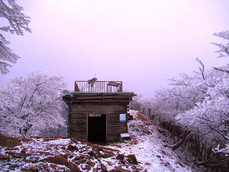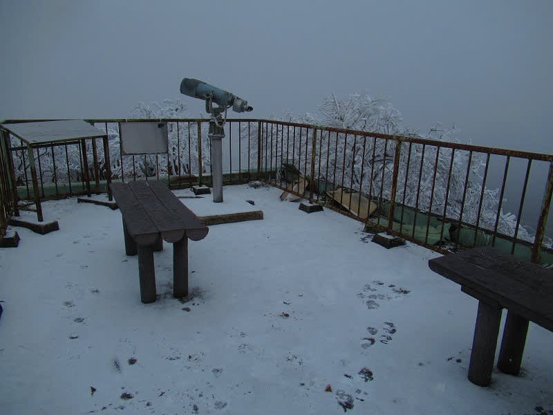 非常に寒いので 山頂からすぐに引き返して 展望台へ上がります。先ほどの避難小屋の